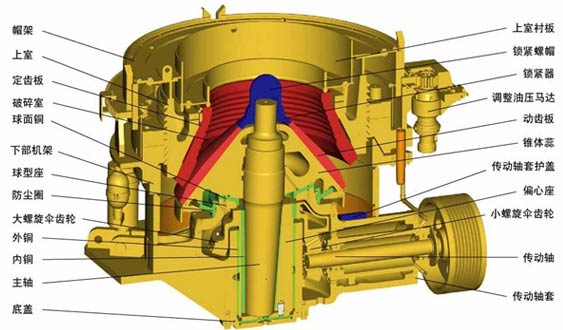 圓錐式破碎機主要由機架、定錐總成、動錐總成、彈簧機構、碗型軸架部以及傳動等部分組成。另外圓錐式破碎機輔助部分由電氣系統、稀油潤滑系統、以及液壓清腔系統組成。以下是介紹圓錐式破碎機的結構組成。
