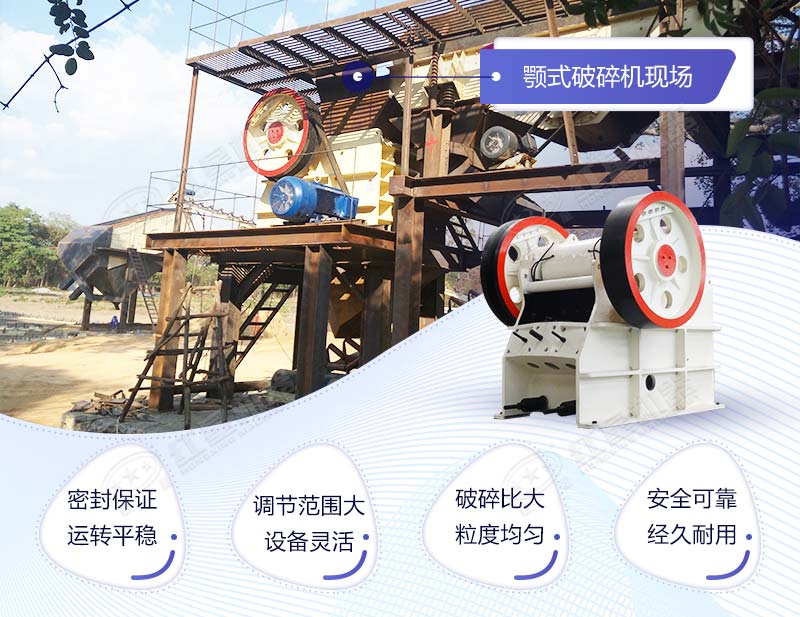該pex250*750顎破設備結構特殊緊湊,特殊的顎頭結構,密封保證,延長軸承壽,特殊飛輪設計,有效減少震動,機器運轉更平穩;接著是排料口的調整裝置采用墊片式,調節范圍大,設備靈活;然后,破碎腔深并且無死區,破碎比大,產品粒度更均勻;最后要數整體鑄造,采用全新的裝配工藝,與機架相互配合,安全系數高。這是該顎式破碎機pex250*750的結構優勢。